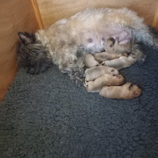 This bundle of adorable puppies made an appearance in the early hours of yesterday (16th August) Tilda has been a fantastic mum again, sadly we lost one boy, who was born sleeping, but these seven are gaining weight rapidly. They are all good sized and a variety of colours, red/wheaten and brindles. We look forward to seeing them grow and will keep the website updated on their progress. There are five boys and two girls in the litter.